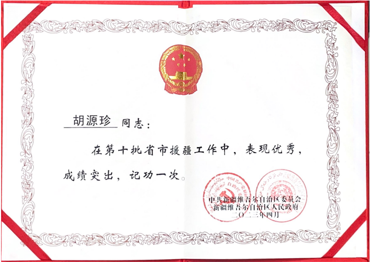近日,beat365beat365亚洲版官网胡源珍教师被中共新疆维吾尔自治区委员会、新疆维吾尔自治区人民政府评为“第十批省市优秀援疆干部人才”,因在援疆工作中表现优秀、成绩突出,记功一次。