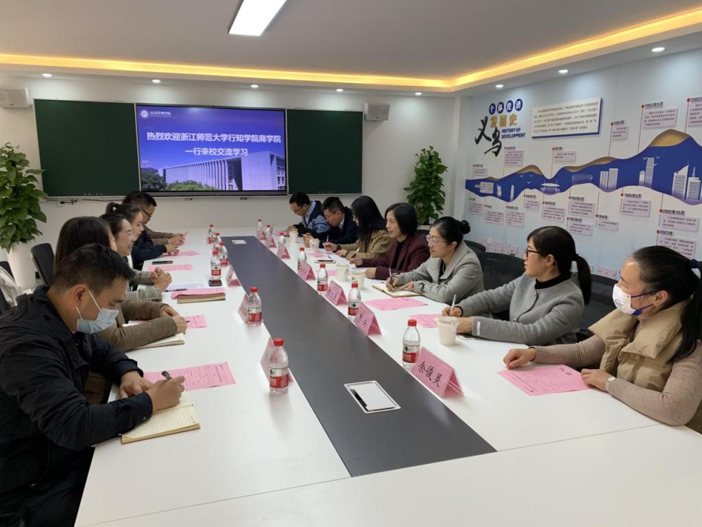11月29日下午,浙江师范大学行知学院商学院院长麻勇爱一行7人来我校考察交流。beat365亚洲版官网教学负责人,金融服务与管理、工商企业管理专业负责人及相关专任教师参加座谈。