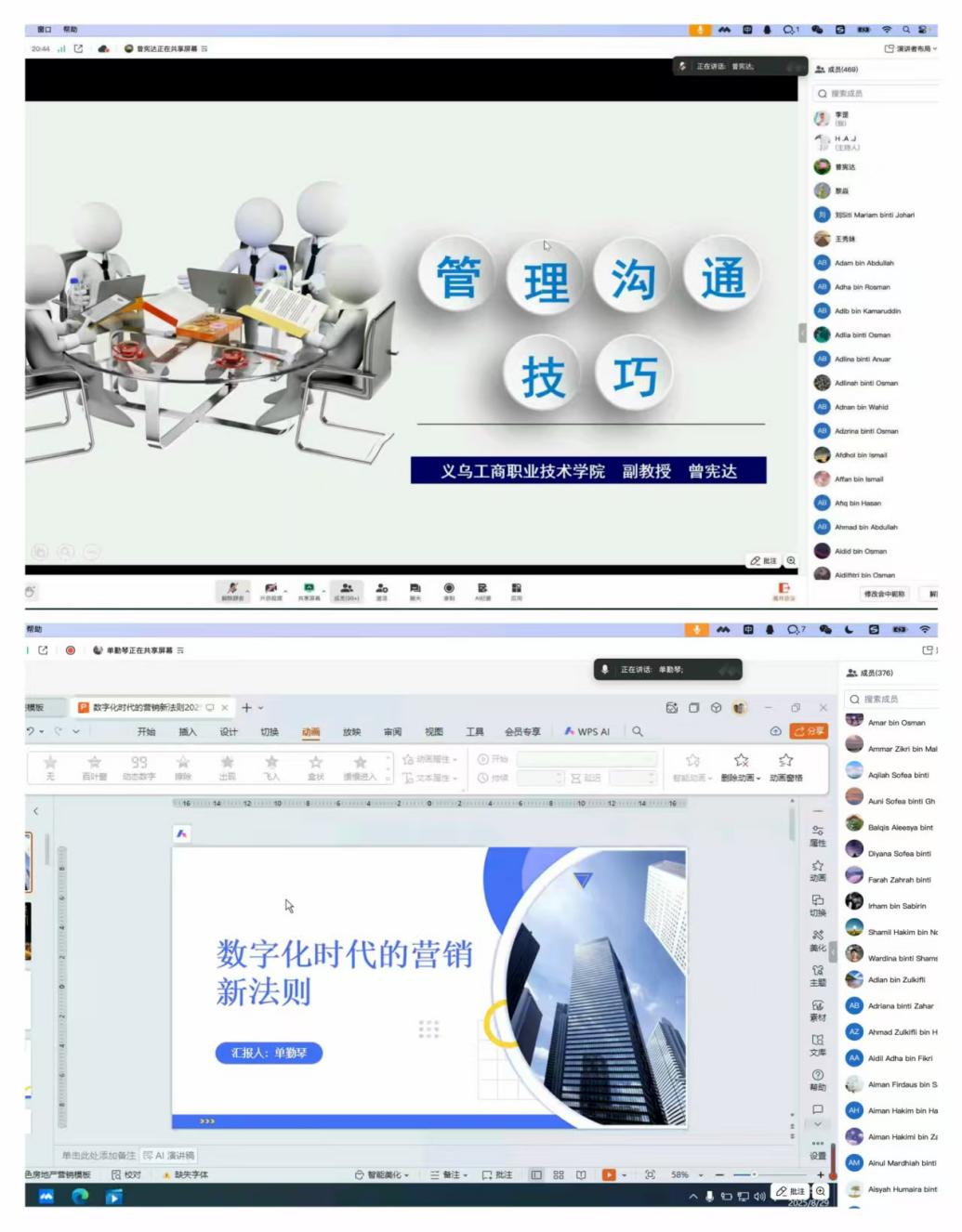 马来西亚义乌丝路学院遴选优质师资,精心设计培训内容,既有中国传统文化,又有企业管理经验,还有数字化营销等,实现了传统文化、市场治理与现代商业实操的有机贯通,理论与义乌实践深度融合。学院潘建林教授以《西游记》团队为案例,系统解析优秀团队的五大核心特征与实践路径;钱志芳教授深掘中华传统商礼“仁、敬、孝、雅、信”的文化内涵,结合义乌“颜乌”故事与小商品市场诚信发展史展现文化与商业的融合魅力,又深入讲解义乌小商品市场“四期发展、六代选代”历程与数字化管理服务模式;曾宪达副教授聚焦企业管理,拆解降本增效与职场沟通技巧;单勤琴副教授围绕数字化营销,阐述“人·场·品·单”四要素与行业未来趋势。课程内容得到学员一致好评。