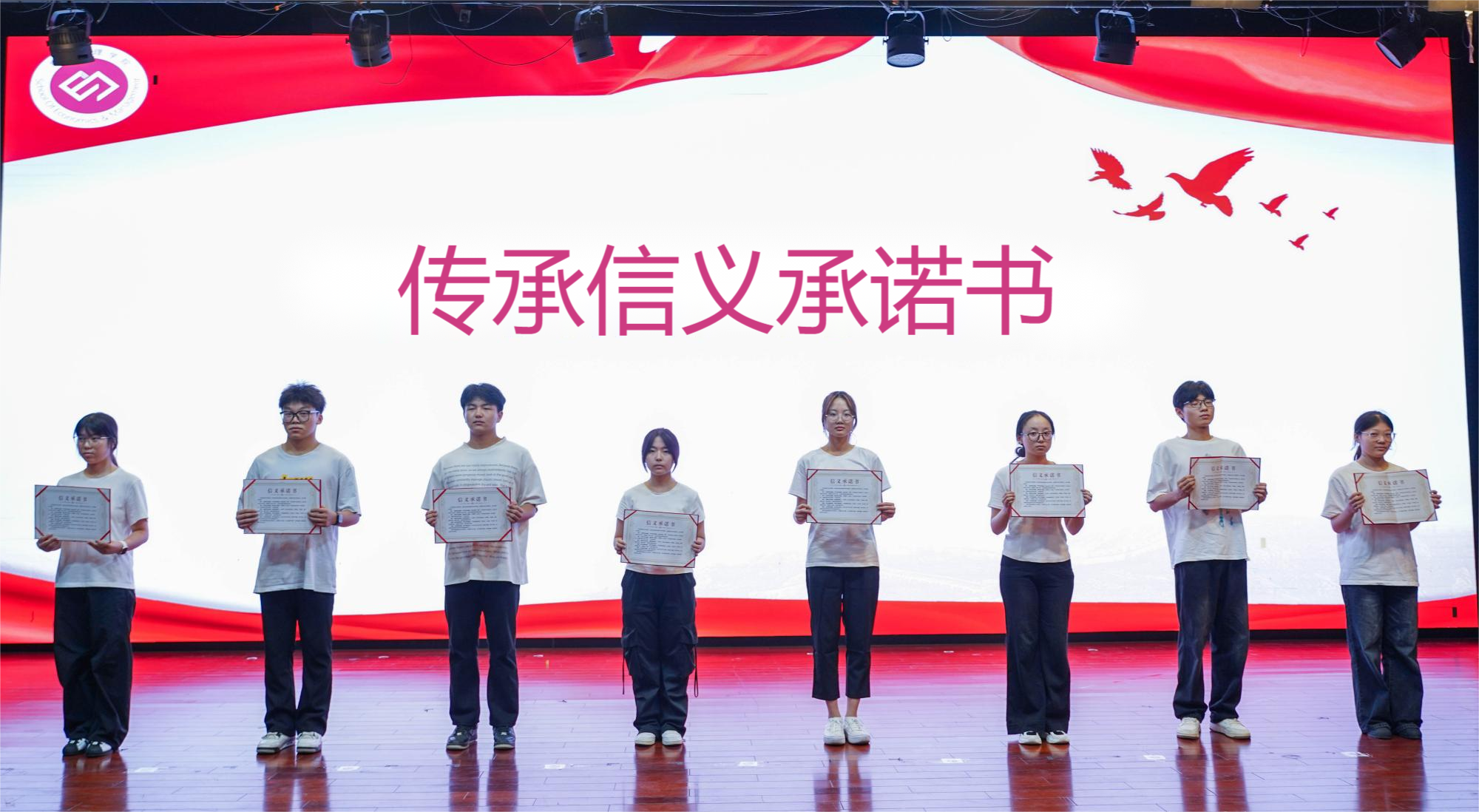 随后,活动现场举行信义承诺书传承仪式。新生代表从老生代表手中接过信义承诺书,传承好学院的信义文化精神。2025级市场营销专业新生季海林说:“作为刚入学的新生,今天从学长学姐手中接棒信义承诺书,感觉就像接过了一份沉甸甸的责任,往后我会把‘守信’落实到小事里,和大家一起做学院‘信义’文化的践行者。”