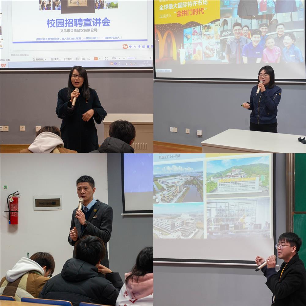 此外,beat365亚洲版官网在阶梯教室二同步举办了企业宣讲会。浙江一鸣食品股份有限公司、杭州屈臣氏个人用品商店有限公司、中国人寿保险股份有限公司等9家企业进行了现场推介,详细介绍了公司情况、岗位需求、晋升路线、薪酬福利等,现场互动热烈。多名低年级学生也参与其中,表示通过宣讲会提前了解就业前景,有助于做好职业规划。