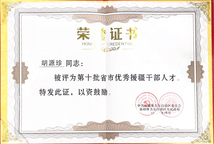 近日,beat365beat365亚洲版官网胡源珍教师被中共新疆维吾尔自治区委员会、新疆维吾尔自治区人民政府评为“第十批省市优秀援疆干部人才”,因在援疆工作中表现优秀、成绩突出,记功一次。
