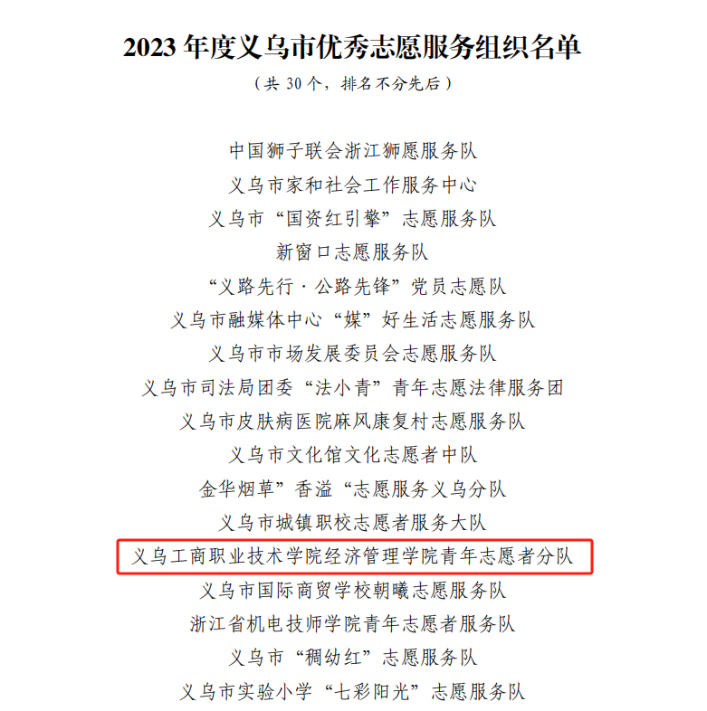 日前,义乌市精神文明建设委员会办公室下发《关于命名2023年度义乌市志愿服务工作先进典型的决定》,其中beat365亚洲版官网beat365亚洲版官网的青年志愿者分队被命名为2023年度义乌市优秀志愿服务组织。