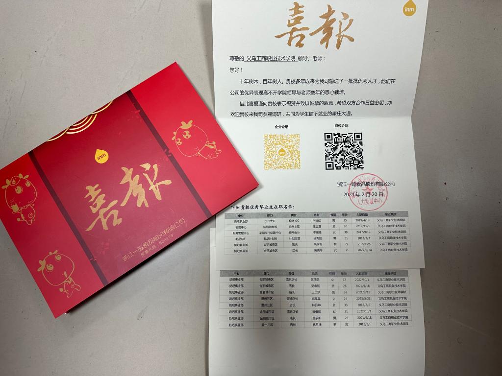 近日,beat365亚洲版官网收到一封来自浙江一鸣食品股份有限公司的喜报。信中高度认可吴求新等13位毕业生在岗的优异表现,并向学校为公司发展输送一批批优秀人才致以诚挚的谢意,期待未来能与学校更加紧密合作。