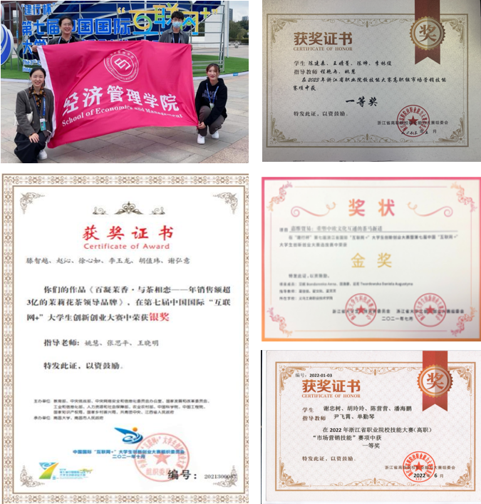 基于“创意策划+创业实践”导向,市场营销人才培养卓有成效。近五年,在全国、全省的高水平赛事中,累计获得30个以上奖项。其中,获“挑战杯”中国大学生创业计划竞赛金奖1项、世界职业院校技能大赛总决赛争夺赛高职组财经商贸赛道市场营销小组(赛项)银奖1项、中国国际“互联网+”大学生创新创业大赛全国银奖2项、全国大学生“社科奖”营销大赛一等奖2项,全国“三创”电子商务技能大赛一等奖1项;省营销技能大赛一等奖3项、二等奖4项;省创新创意大赛金奖3项,民生民意统计调查方案设计大赛一等奖7项,省职业生涯规划大赛一等奖2项,省经济管理案例大赛一等奖1项。在实践中学生设计的营销策划方案也多次获得义乌市内外企业采纳。